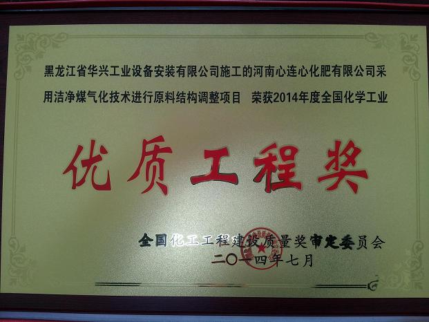 乐投(中国)施工的“河南心连心化肥有限公司采用洁净煤气化技术进行原料结构调整项目”荣获全国化工工程建设质量奖评审委员会颁发的2014年度全国化学工业优质工程奖。